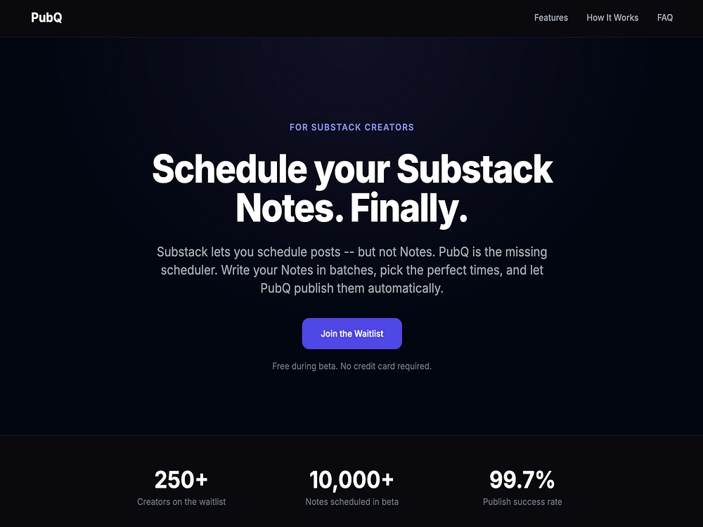 PubQ is a scheduling tool built specifically for Substack Notes. Substack has no native scheduler for Notes, only for long-form posts. PubQ fills that gap: a Chrome extension captures your Substack session and posts your Notes automatically at your chosen time.